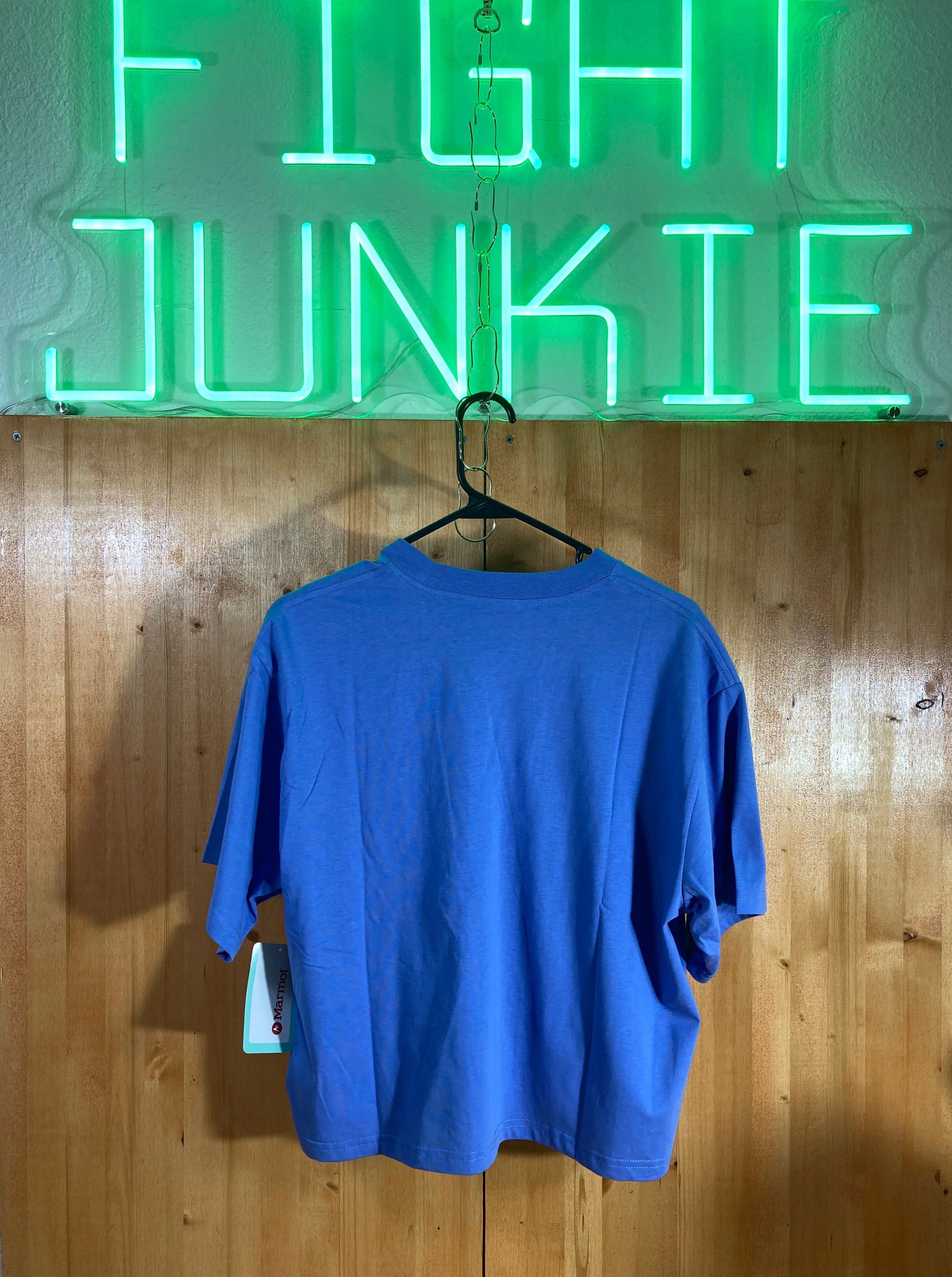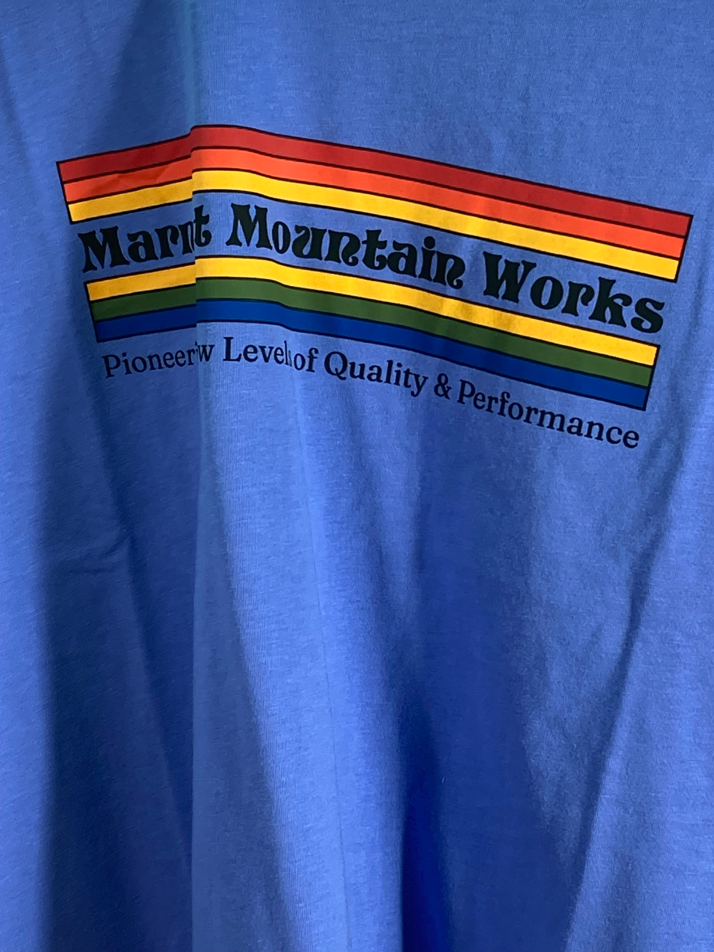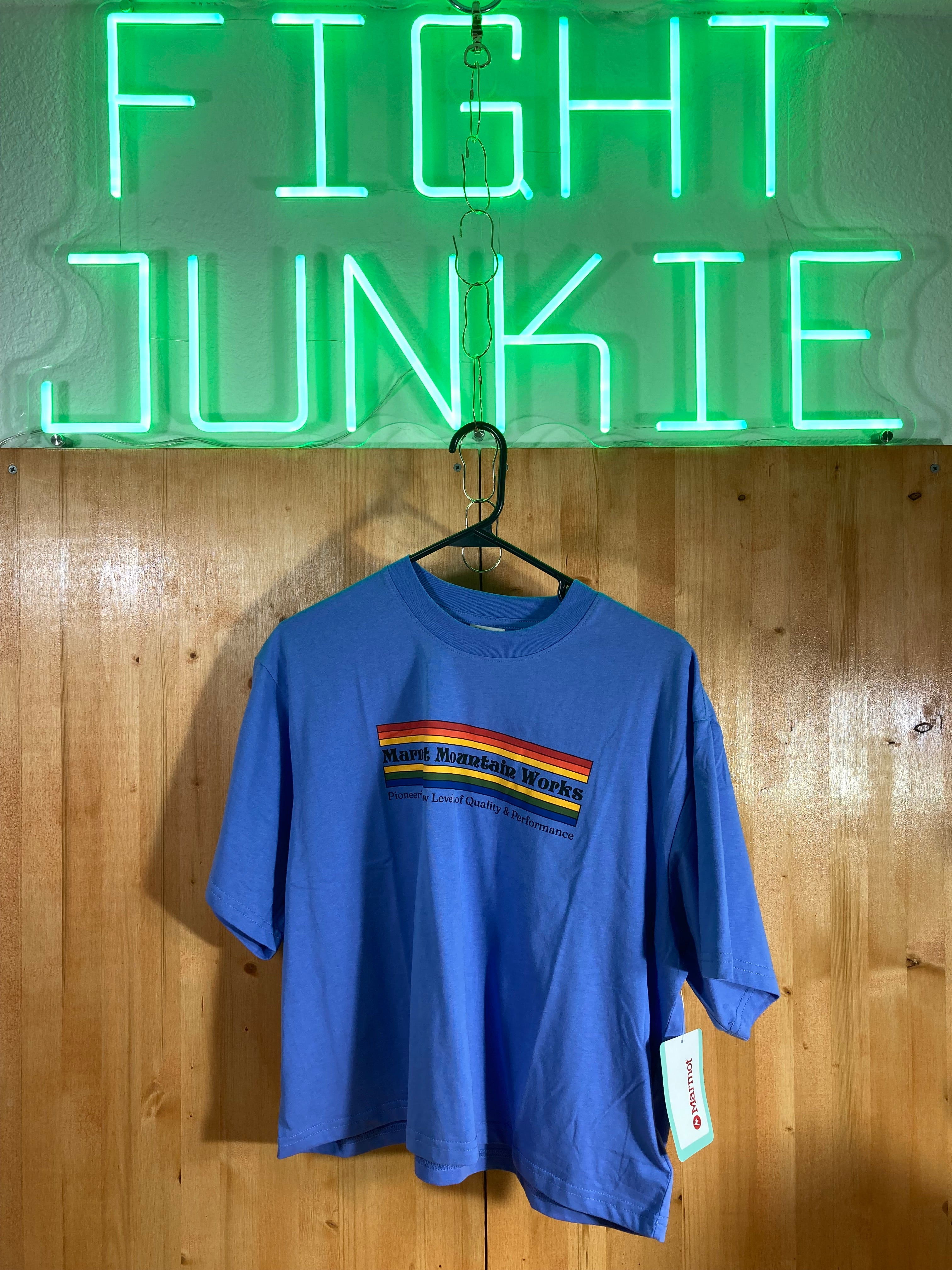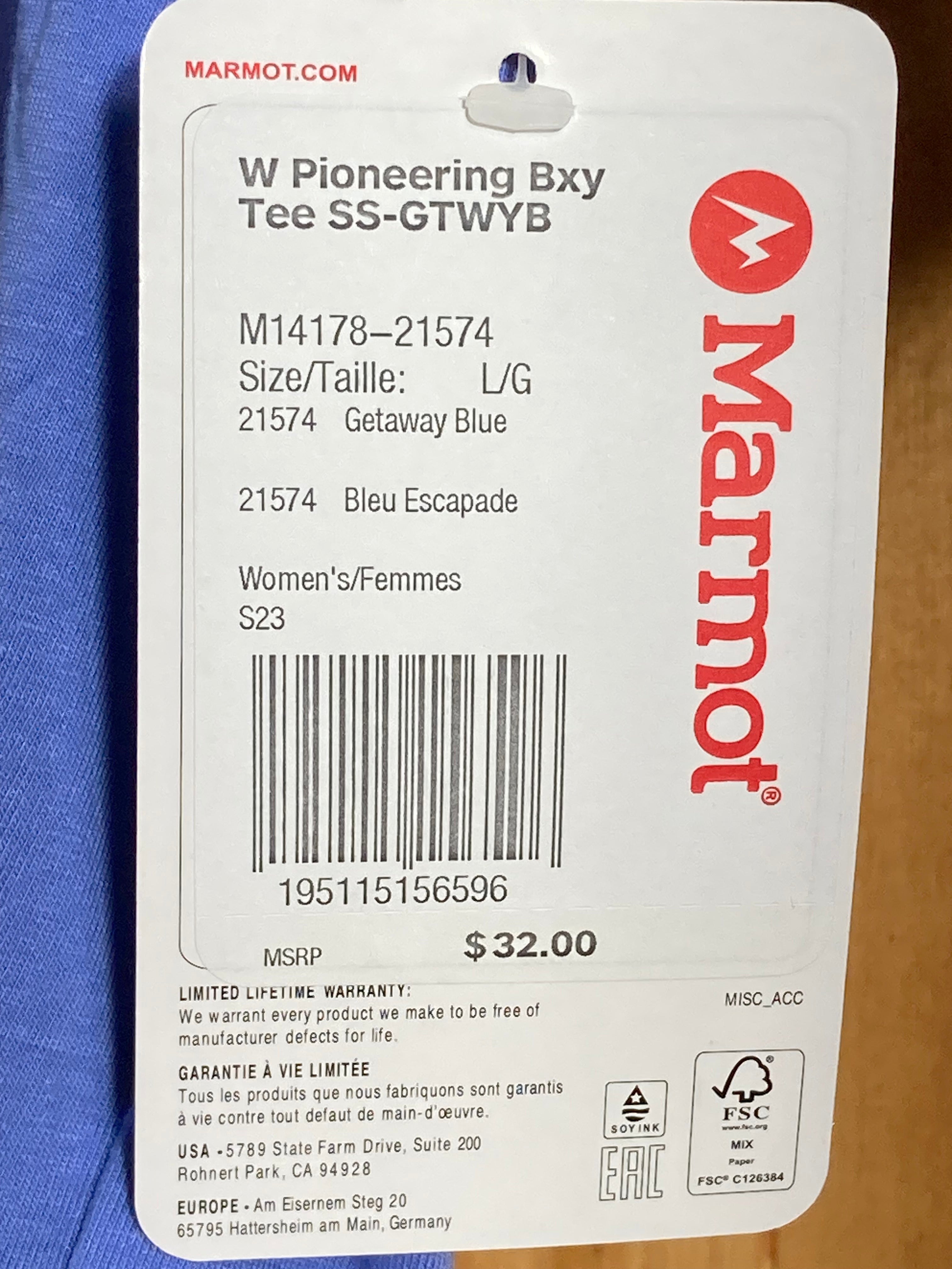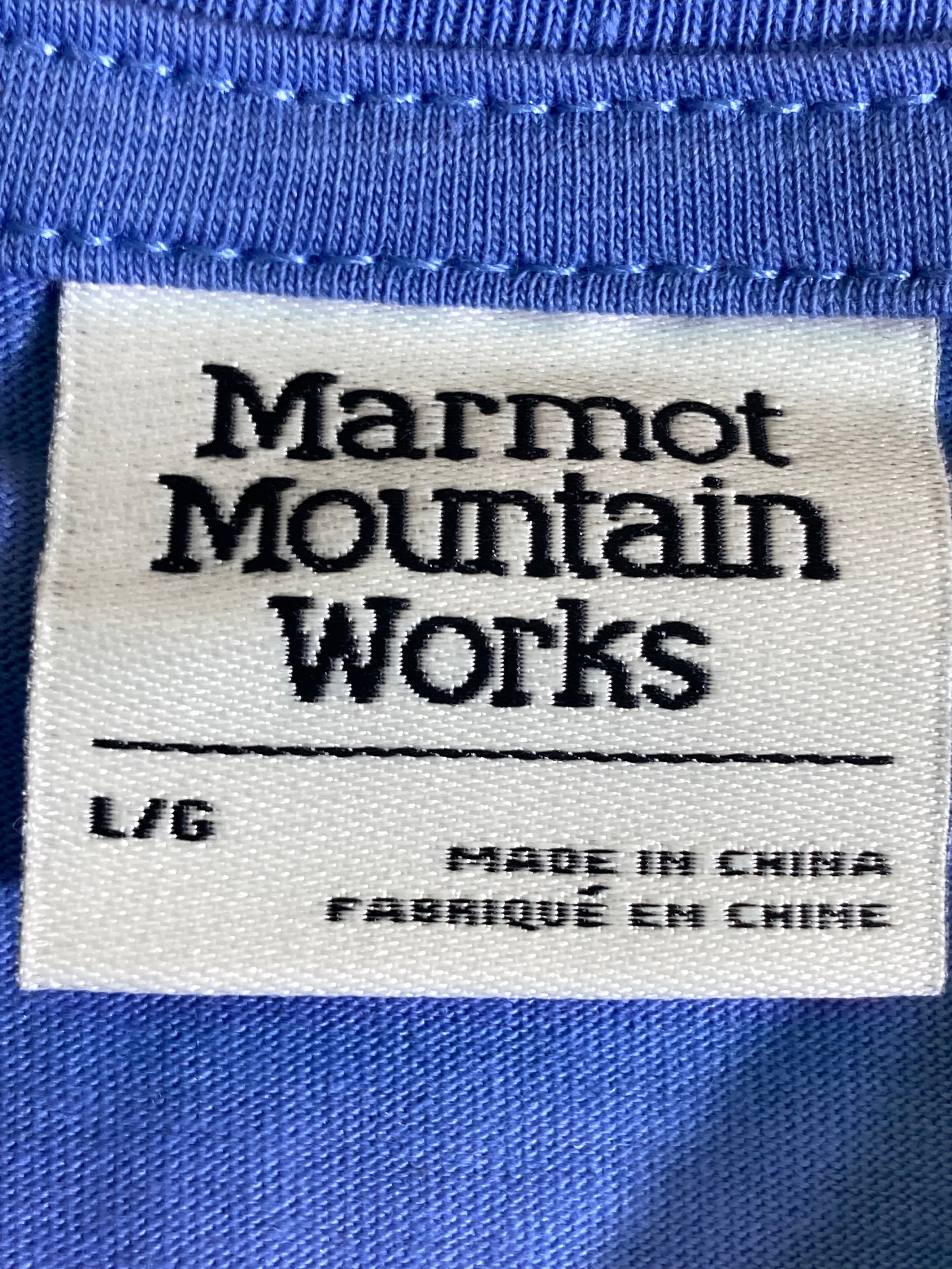 NEW! MARMOT PIONEERING Large L Lrg Cropped Adult Women Graphic Print Short Sleeve Blue Shirt Top